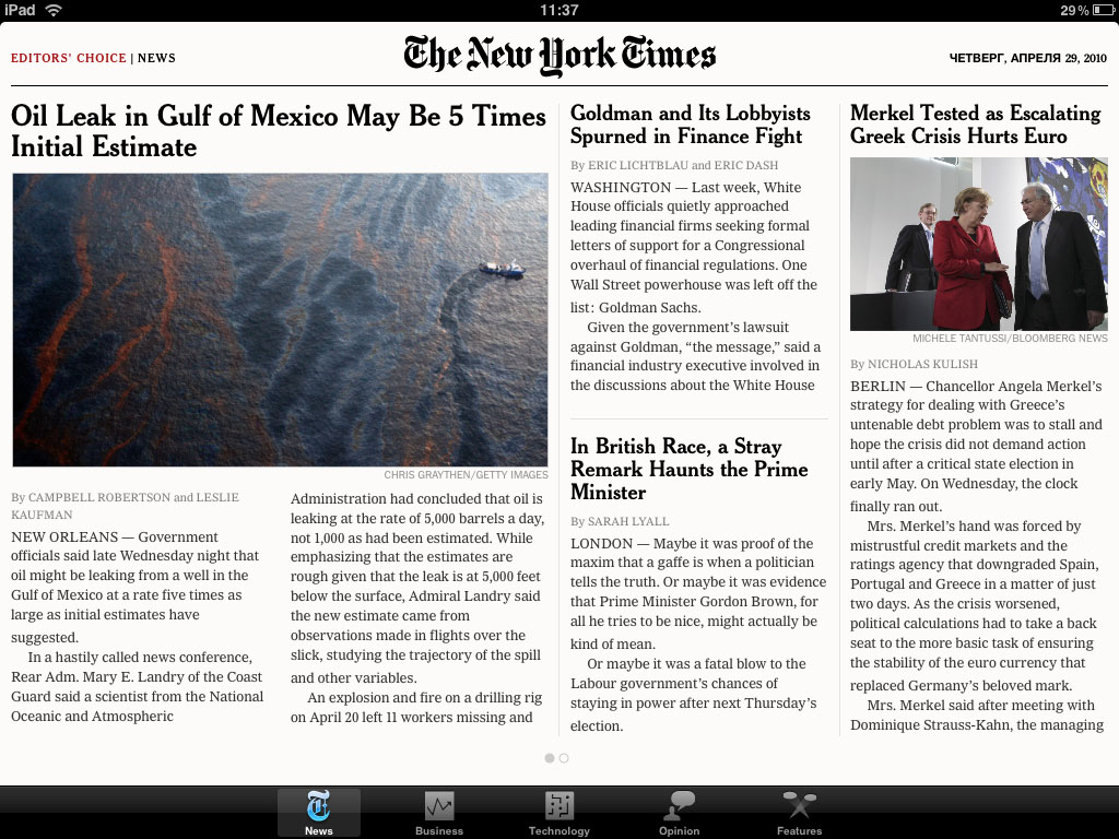 Первым из изданий, представивших iPad-версию, стала американская газета The New York Times. Представитель издания даже принял участие в презентации Apple iPad и выступил с кратким рассказом о сотрудничестве Apple и The New York Times. В App Store бесплатное приложение появилось в день старта американских продаж iPad. Тем не менее, вскоре появились слухи о том, что Стив Джобс недоволен iPad-версией NY Times. Так ли это или нет на самом деле — мы не знаем, но, признаюсь, причины для недовольства действительно есть.