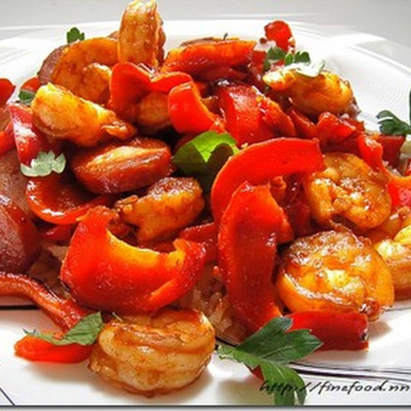 Сверху много-много креветок с колбасой.