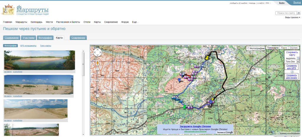 Данный сайт является сообществом путешествующих людей. Здесь выложено большое количество справочной информации, топографические карты, книги, представлены маршруты, ведется календарь событий, осуществляется поиск мест, расписаний и билетов, отелей, работает форум и такие сервисы, как интернет-магазин туристического снаряжения, прокат автомобилей.