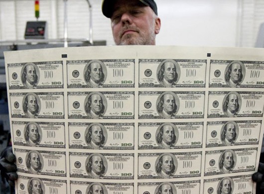 Однодолларовые купюры загружаются в станок в процессе производства в Бюрo США Гравировки и Печати в Вашингтоне 14 ноября 2014 года. Партия новых купюр предназначена для Нью-Йоркского Федерального резервного банка.