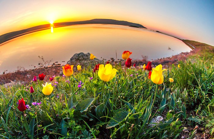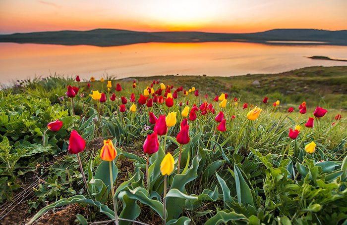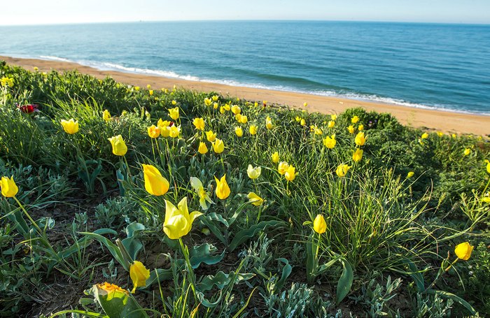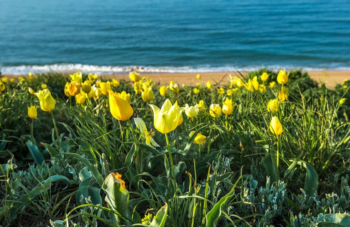 На том же Керченском полуострове можно встретить ещё одно прекрасное явление – цветение диких тюльпанов прямо у морского побережья. Они носят название тюльпаны Шренка и входят в списки Красной книги России. Период их цветения приходится на весь апрель и май, а уже в июне растения плодоносят.